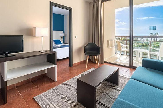4 people max + cot: one bedroom + living room with sofa bed. These modern suites are equipped with a satellite TV (flat screen), a fridge, a safe, a kitchenette, telephone, Wi-Fi connection, an electric kettle, a desk, a sofa, a private bathroom with bathtub and a balcony with sea or city view.